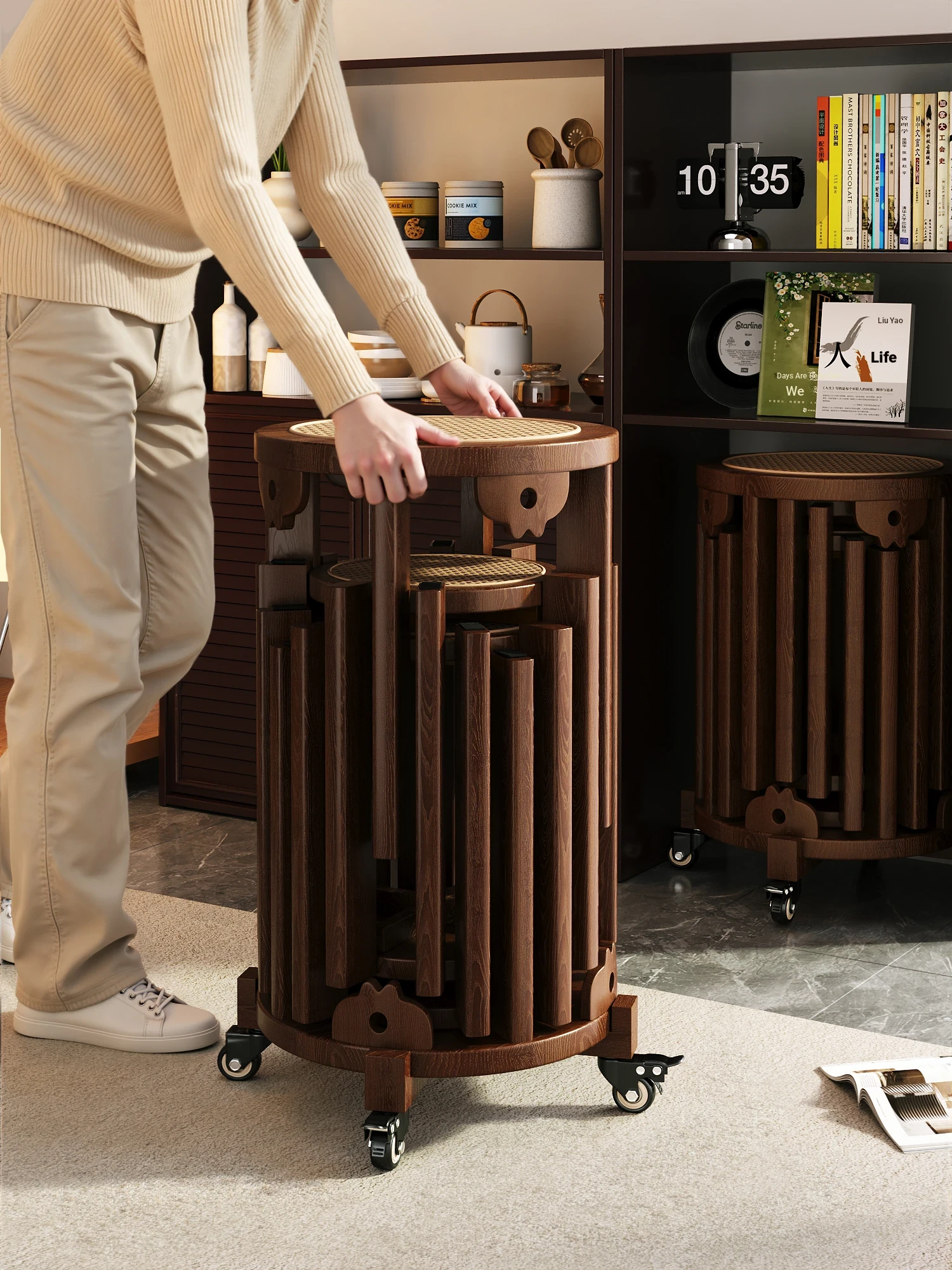 Durable Solid Wood Stools for Home Use - Stackable Square Dining Bench with Wheels, Perfect for Chinese Living Rooms and Restaurants - Space-Saving and Stylish Design