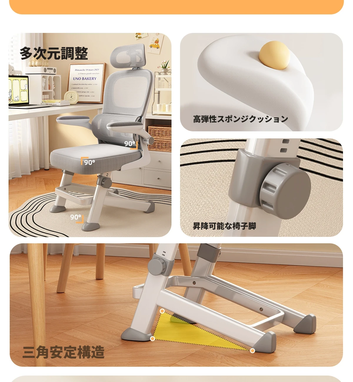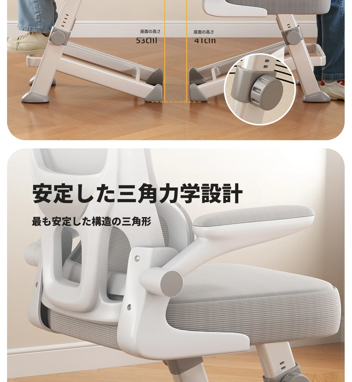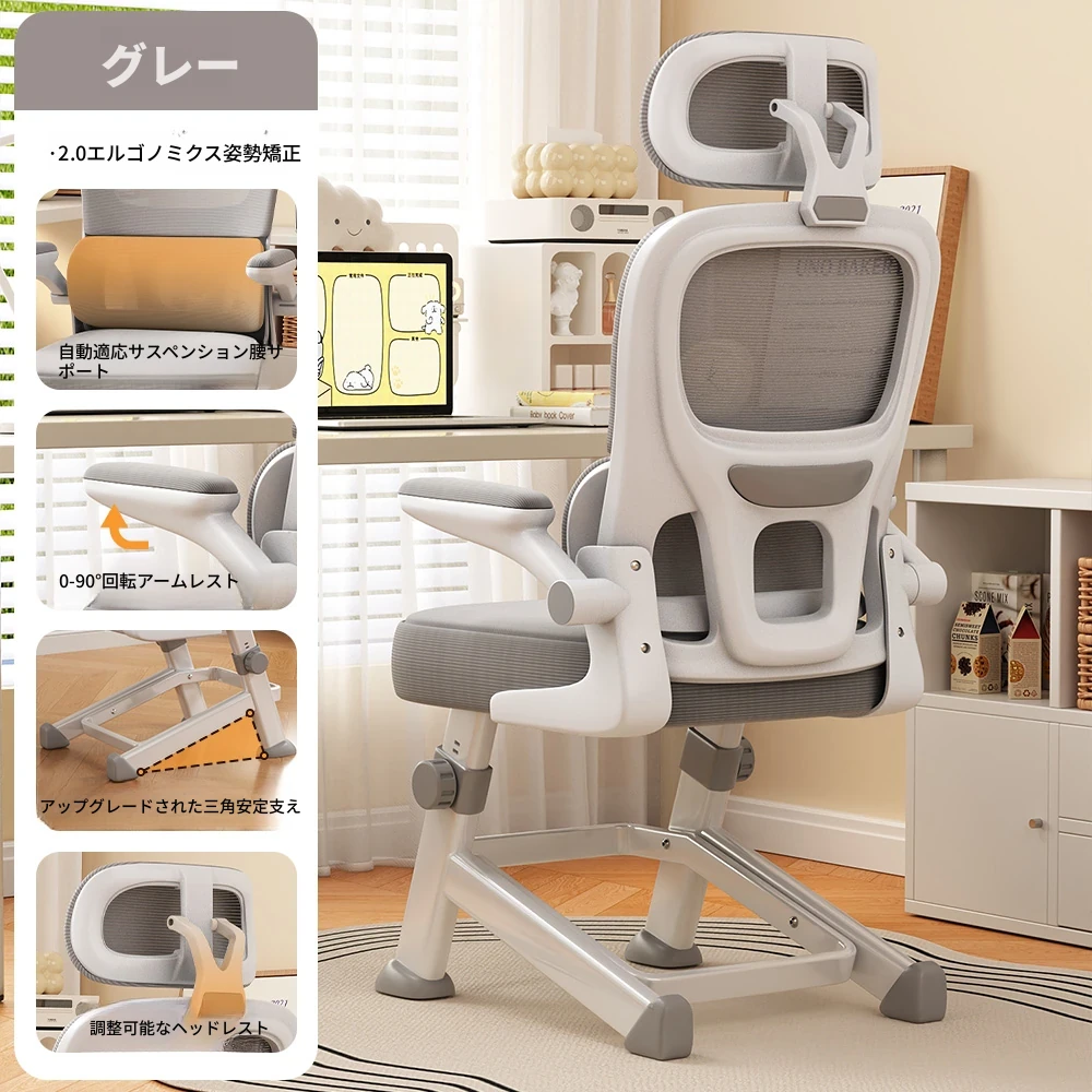 【三角永定脚-ミストグレー】⭐自動適応浮遊ウエストサポート+高反発スポンジクッション+7段階昇降調節+ヘッドレスト