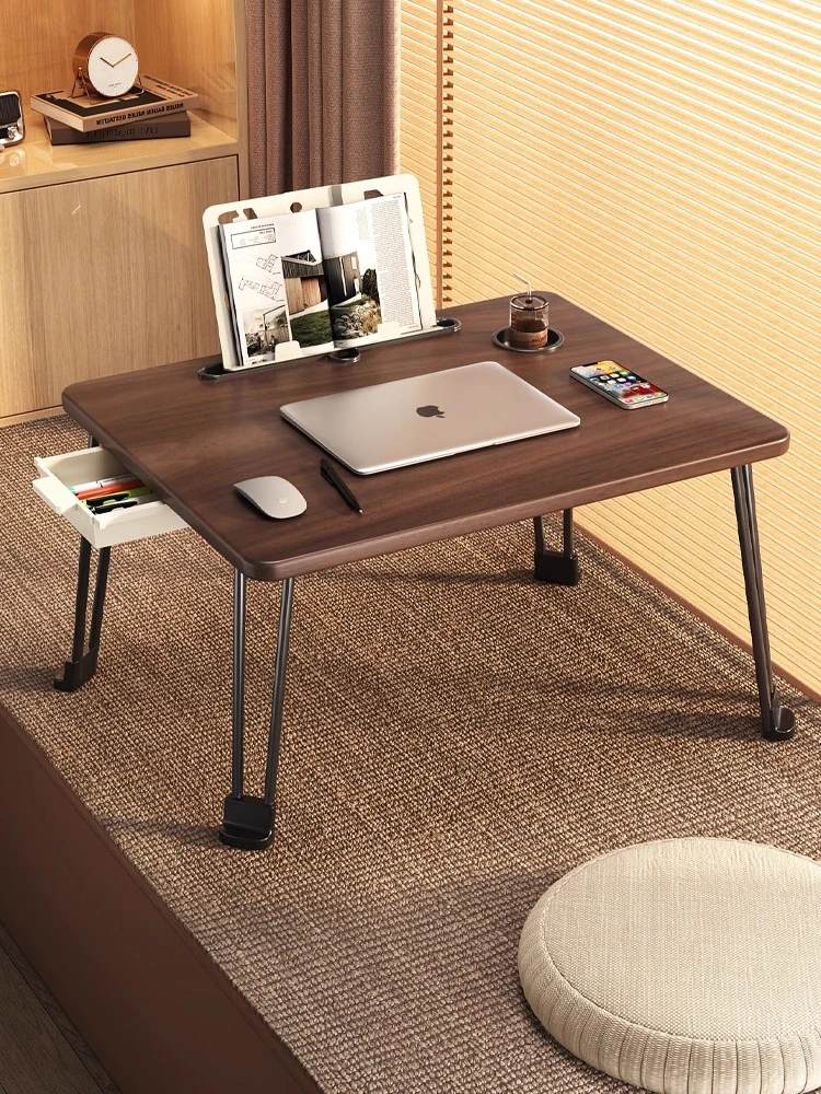 Foldable Bay Window Table - Versatile Coffee Table for Tatami and Bedside Use, Walnut Wood Design for Bedroom, Perfect Low Sitting Table for Cozy Spaces