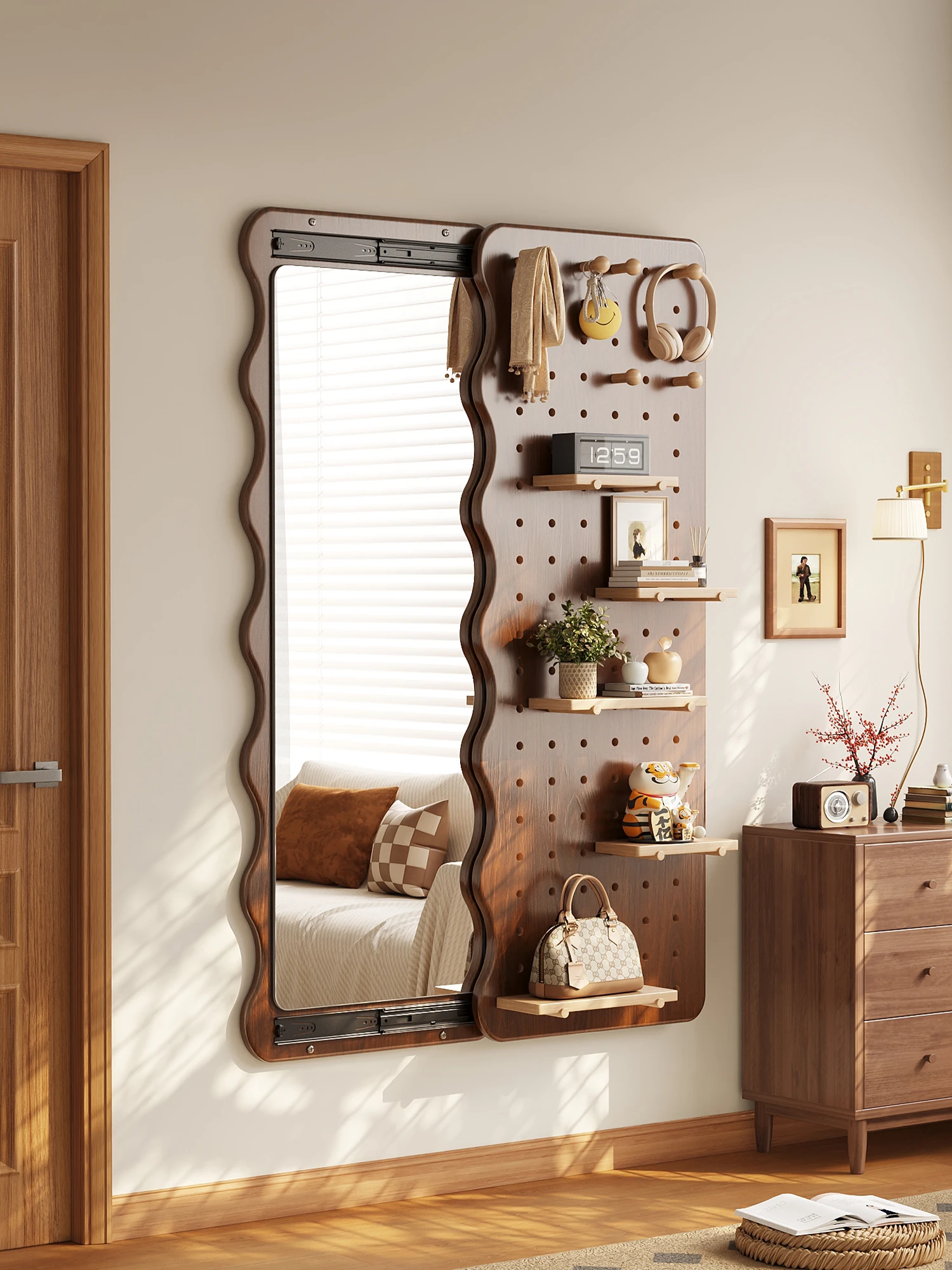 Solid Wood Pegboard Full-Length Mirror with Hidden Sliding Design - Wall-Mounted, Space-Saving Dressing Mirror for Home Entryway and Fitting Room