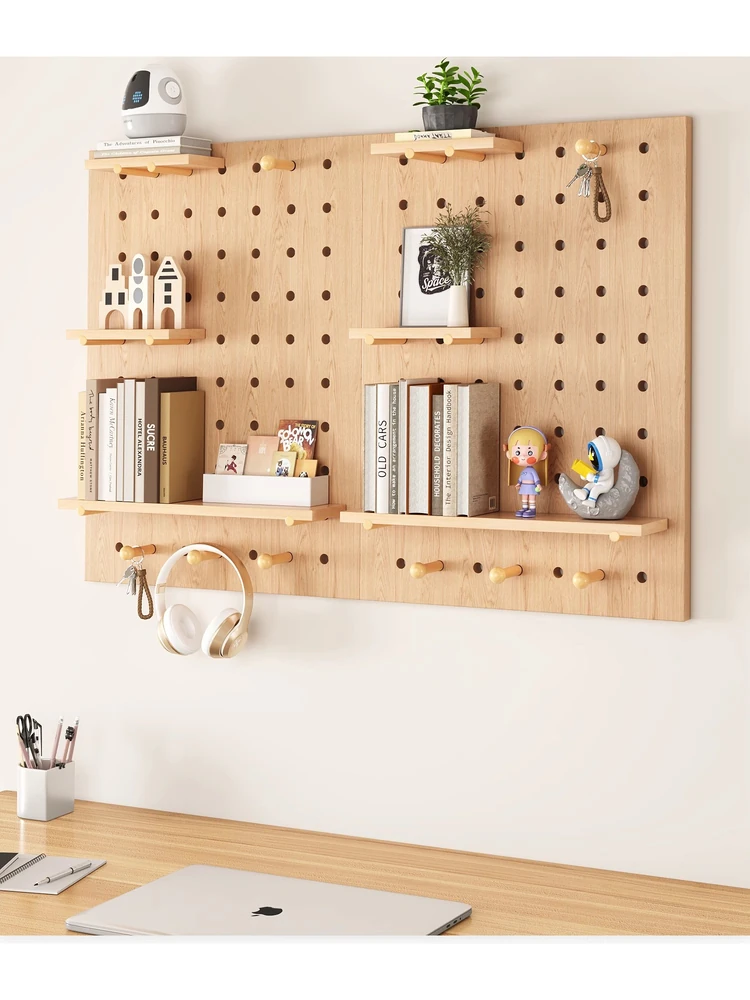 Wooden Wall-Mounted Pegboard Shelving Unit - Stylish Display Rack for Home Office, Decorative Wall Panel, Entryway Coat Hanger, and Organizer.